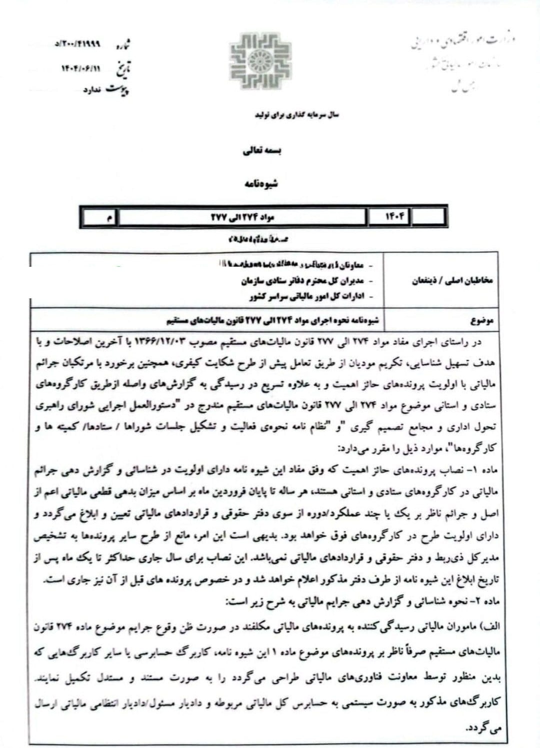 در راستای اجرای مفاد مواد ۲۷۴ تا ۲۷۷ قانون مالیات مستقیم مصوب ۱۳۶۶/۱۲/۰۳ و آخرین اصلاحات آن، این دستورالعمل با هدف تسهیل شناسایی مودیان و تکریم آنان تنظیم شده است که از دیدگاه کارشناسان و مشاور مالیاتی در مشهد نقش مهمی در بهبود تعامل میان مودیان و سازمان امور مالیاتی دارد. این فرآیند از طریق تعامل بیشتر و بدون اتکا صرف به طرح شکایت کیفری انجام میشود. همچنین، این دستورالعمل بر برخورد با مرتکبان جرائم مالیاتی با اولویت پروندههای مهم تأکید دارد. علاوه بر این، تسریع در رسیدگی به گزارشهای واصله از طریق کارگروههای ستادی و استانی، مطابق مواد ۲۷۴ تا ۲۷۷ قانون مالیاتهای مستقیم و مندرج در «دستورالعمل اجرایی شورای راهبری تحول اداری و مجامع تصمیمگیری» و «نظامنامه نحوه فعالیت و تشکیل جلسات شوراها/ستادها/کمیتهها و کارگروهها» مورد توجه قرار گرفته است. بر این اساس، موارد زیر مقرر میگردد: