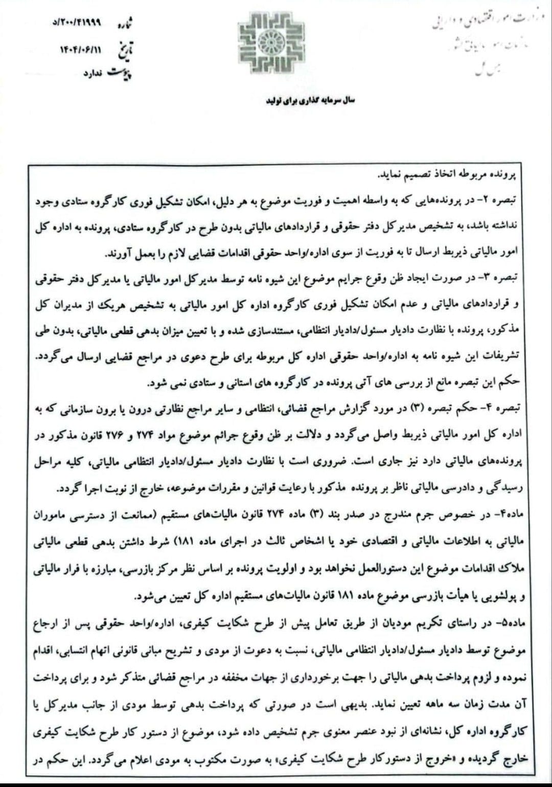 بدیهی است تشخیص مدیرکل ذیربط یا دفتر حقوقی و قراردادهای مالیاتی میتواند موجب طرح سایر پروندهها نیز شود.