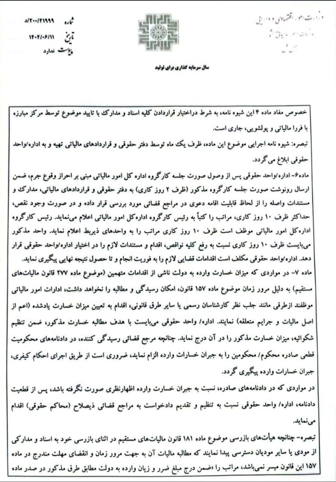 شیوهنامه اجرایی این ماده ظرف یک ماه توسط دفتر حقوقی و قراردادهای مالیاتی تدوین و ابلاغ میشود.