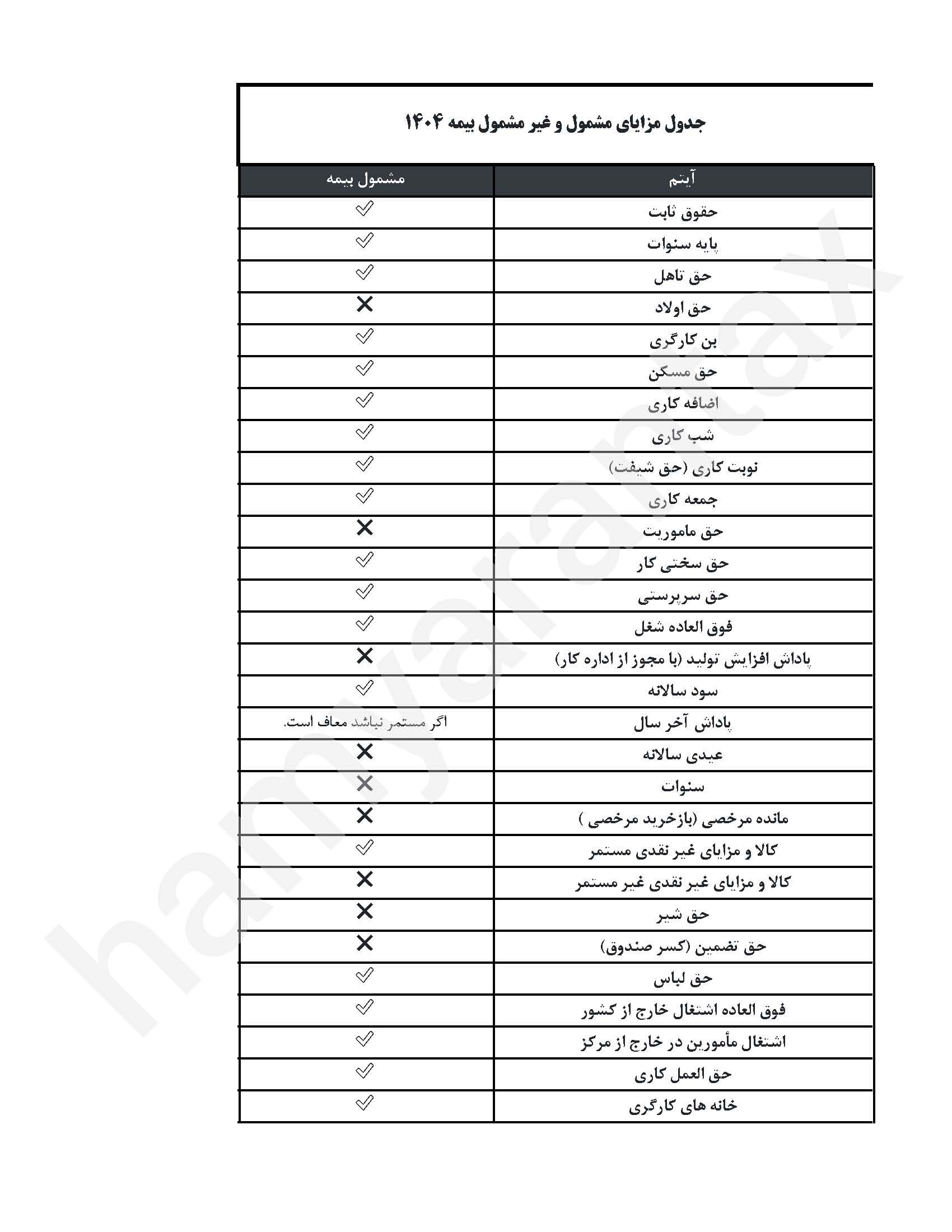 - حق تاهل مشمول بیمه می شود؟ بله، از سال ۱۴۰۳ به عنوان مزیت مستمر مشمول کسر بیمه است.