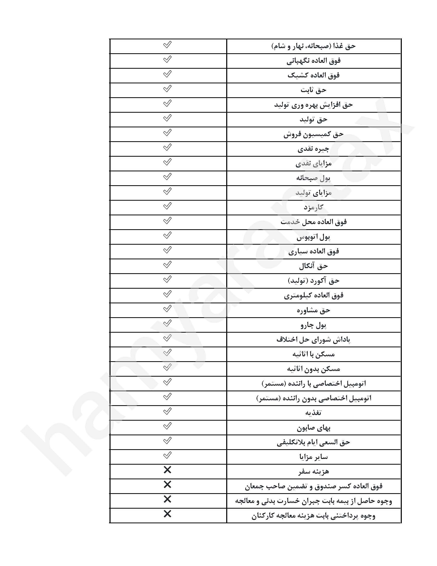 - سنوات پایان خدمت: ۳۰ روز مزد ثابت برای هر سال کار، غیر مشمول.
